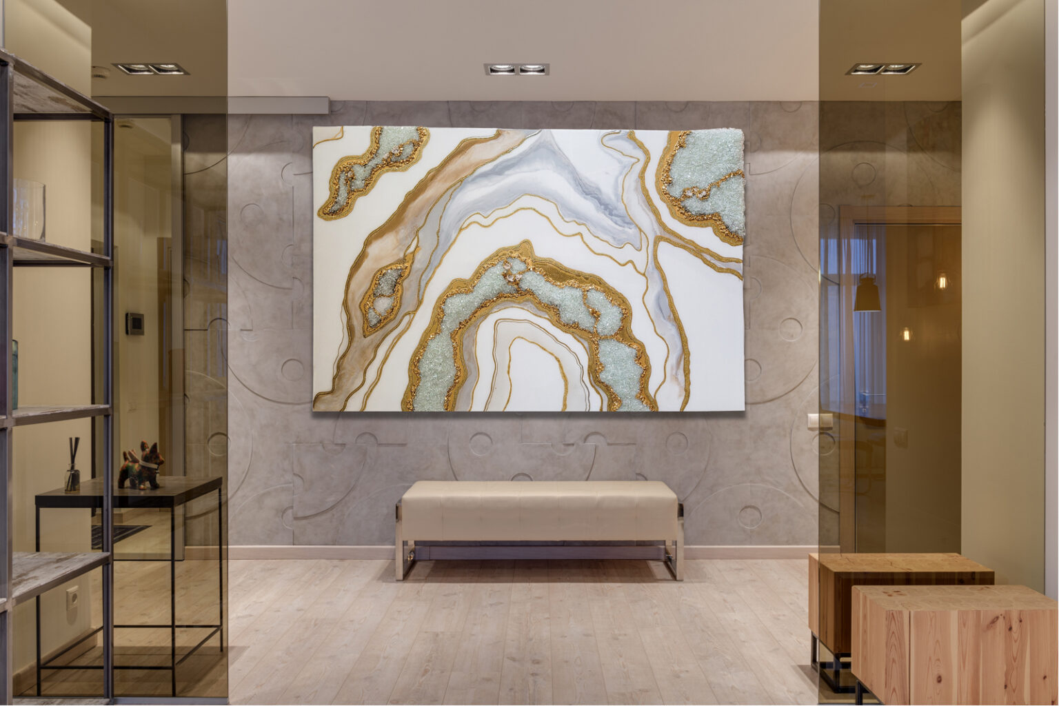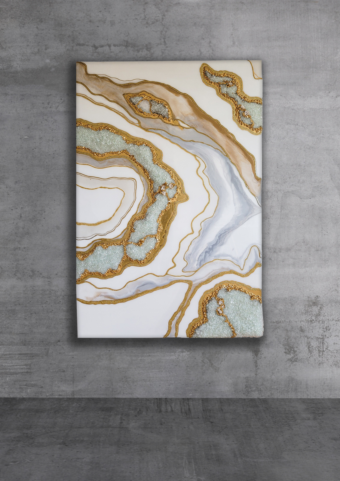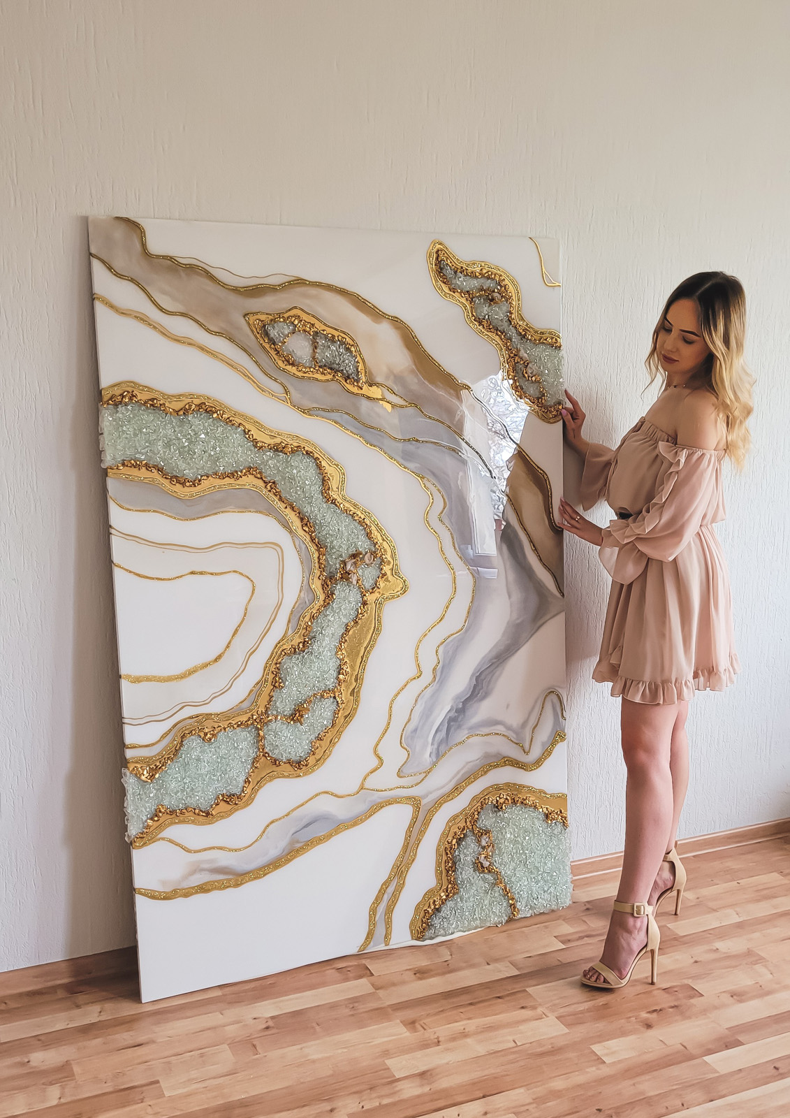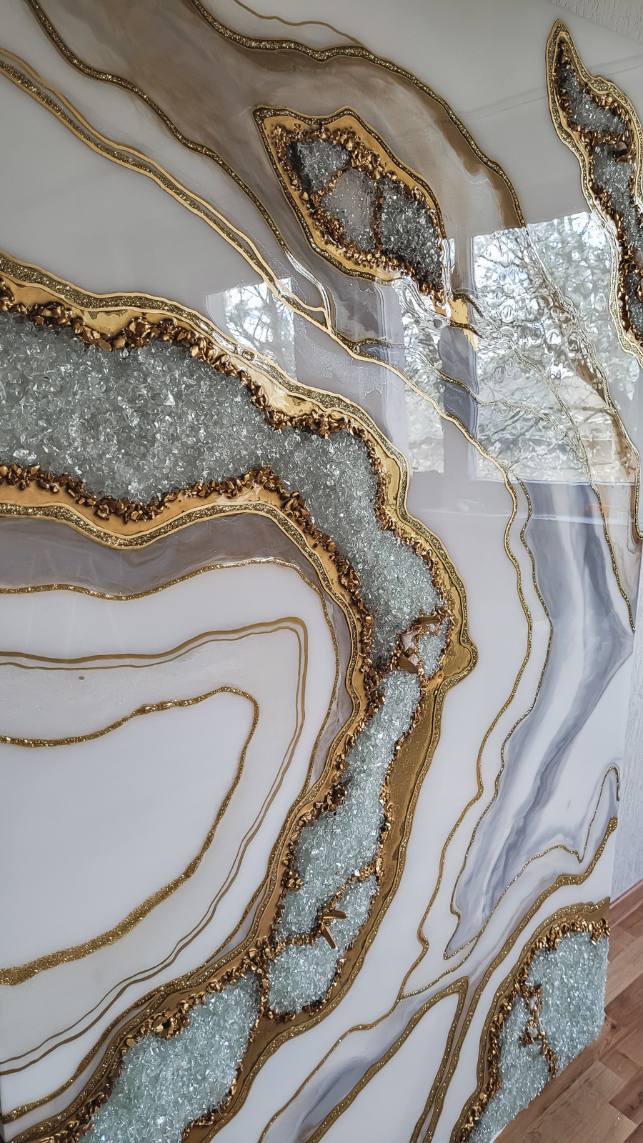 100×70 cm. Wykonany z żywicy epoksydowej, szkła, kryształów górskich.