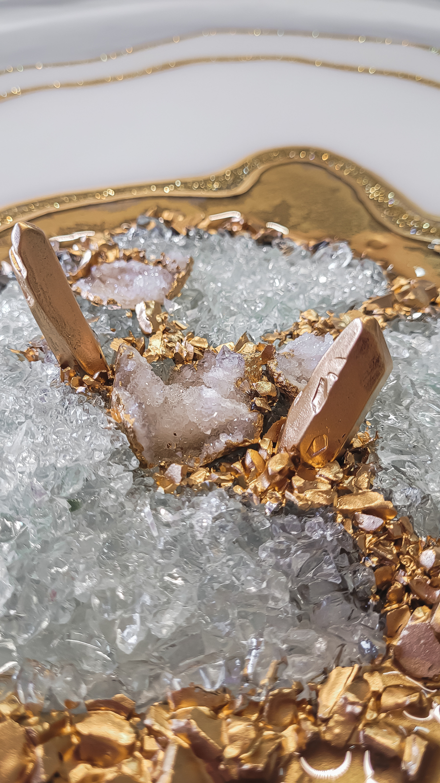 Wykonany z żywicy epoksydowej, szkła, kwarcu, kryształów górskich.